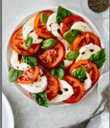 이탈리아 국기 색인 **빨강(토마토), 흰색(모짜렐라), 초록(바질)**을 상징하는 구성으로 유명하며, 보기만 해도 식욕을 돋우는 상큼한 샐러드입니다.